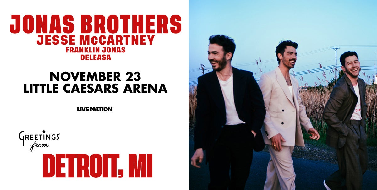 (DETROIT – September 29, 2025) – After launching their milestone ‘JONAS20: Greetings From Your Hometown’ tour in August and playing sold-out shows across the U.S. and Canada, Jonas Brothers announced additional North American dates today. The new dates include a stop at Little Caesars Arena on Sunday, November 23 at 7:30 p.m. and feature support from Jesse McCartney, Franklin Jonas, and Deleasa.