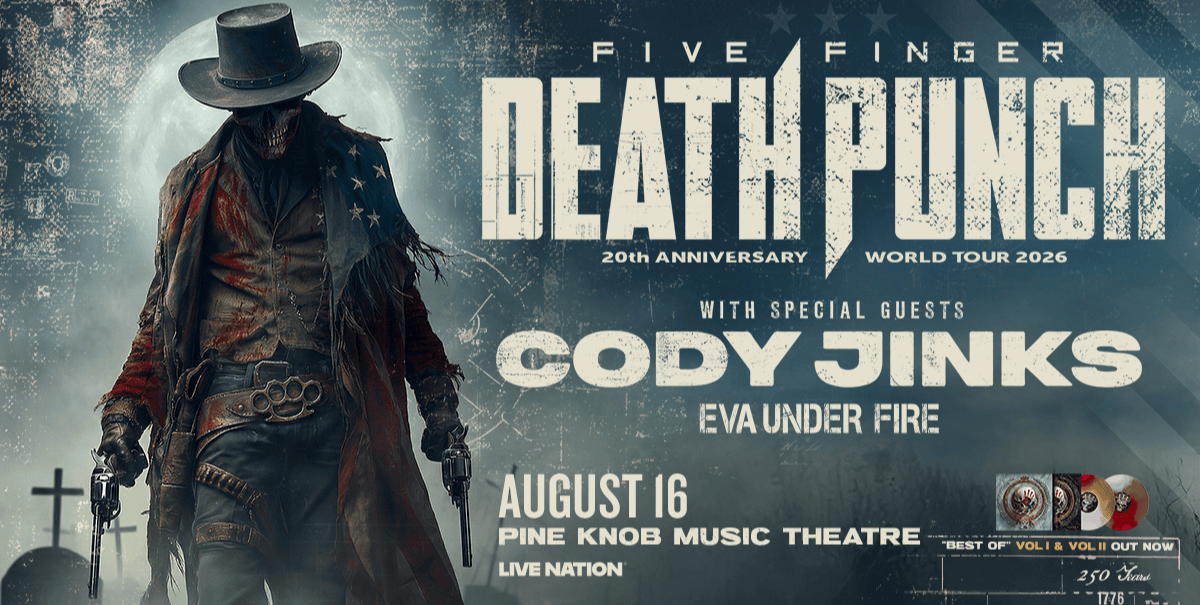 (DETROIT – January 13, 2026) – One of the world’s biggest hard rock bands, multi-platinum powerhouse Five Finger Death Punch announces the first leg of their 2026-2027 World tour. Produced by Live Nation, the massive 48-city tour will visit Pine Knob Music Theatre on Sunday, August 16 at 6:45 p.m. Platinum-certified outlaw country musician Cody Jinks will join the tour as special guest and bring along his current album, In My Blood. The tour lineup will be rounded out by Eva Under Fire, who has earned critical acclaim, and will release a new album, Villainous in 2026. Pine Knob Music Theatre is presented by Proud Partners United Wholesale Mortgage, Trinity Health and Ally.