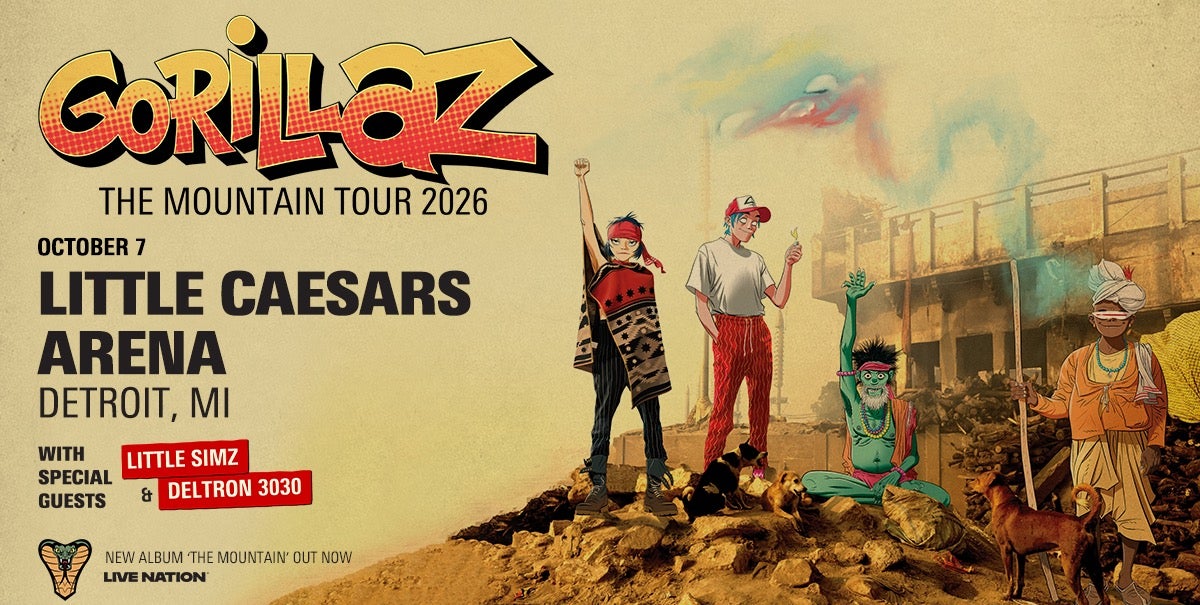 (DETROIT – March 3, 2026) – Following months of speculation and anticipation – as well as a pair of L.A. shows playing new album The Mountain in its entirety and the U.S. opening of their House of Kong exhibition — Gorillaz have confirmed details of their first extensive North American tour since 2022. Produced by Live Nation, the tour will see the world’s most successful virtual act once again brought to life by Gorillaz co-creators Damon Albarn and Jamie Hewlett, with Albarn joined onstage by the Gorillaz live band and very special guest performers. The newly announced series of 22 arena dates across the U.S. and Canada includes a stop with special guests Little Simz and Deltron 3030 at Little Caesars Arena on Wednesday, October 7 at 7 p.m.