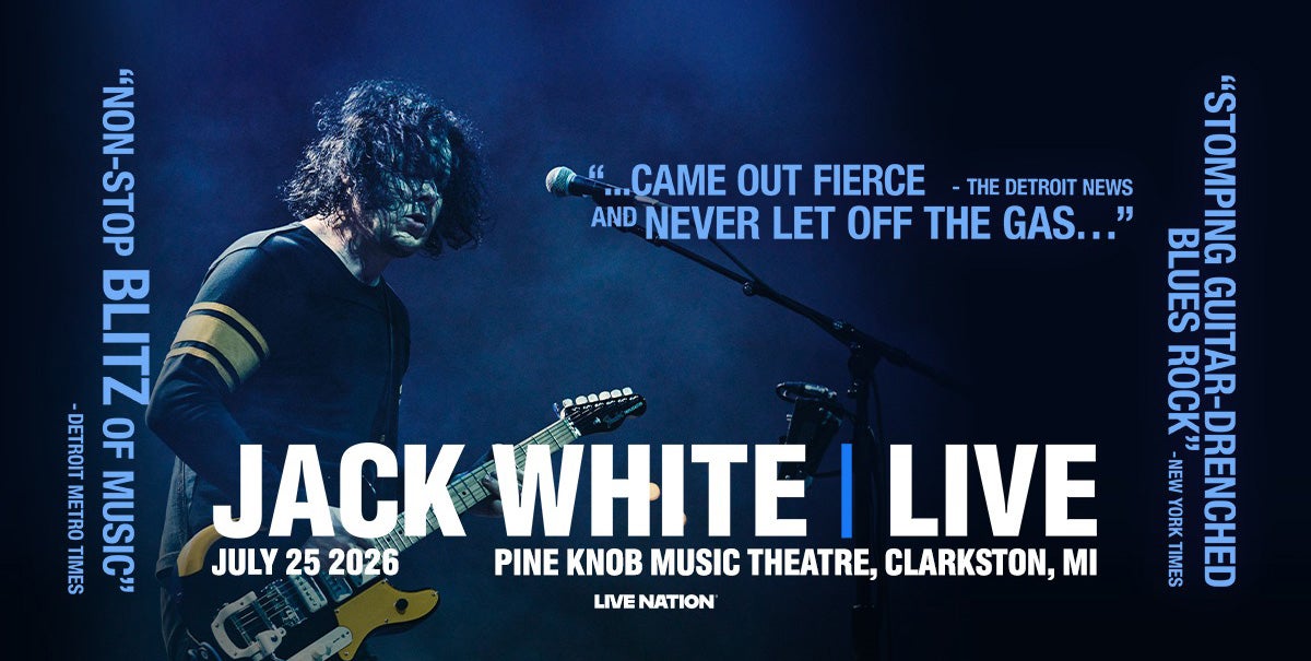 (DETROIT – April 9, 2026) – Jack White has announced plans for a wide-ranging 2026 headline tour that will include a stop at Pine Knob Music Theatre on Saturday, July 25 at 7 p.m. North American dates begin July 10 at Washington, DC's The Anthem and continue through a two-night stand at Atlanta, GA's Coca-Cola Roxy on November 20--21. Highlights include two-night runs in several cities, including Brooklyn, Chicago, Los Angeles, Charlotte, and Miami Beach. Pine Knob Music Theatre is presented by Proud Partners United Wholesale Mortgage, Trinity Health and Ally.