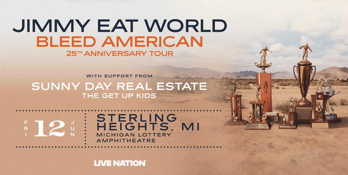 (DETROIT – February 10, 2026) – Arizona rock icons Jimmy Eat World will kick off the celebration for the 25th anniversary of their seminal album Bleed American in a big way — with a massive Live Nation-promoted tour that starts June 9 in Denver, CO at the legendary Red Rocks Amphitheatre and concludes in November at Vans Warped Tour in Orlando, FL. The tour will appear with special guests The Get Up Kids and Sunny Day Real Estate at Michigan Lottery Amphitheatre on Friday, June 12 at 7 p.m.