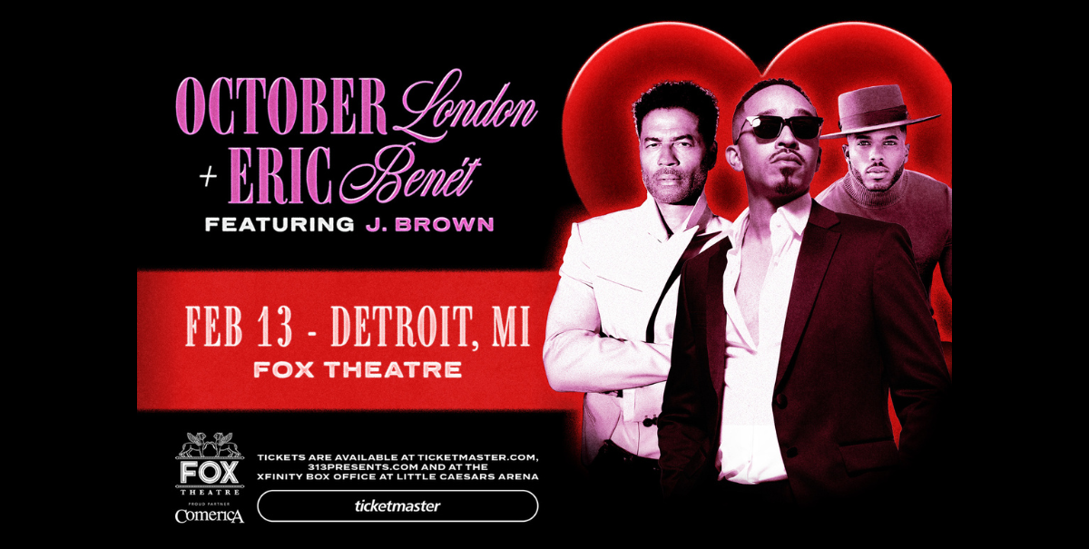 (DETROIT – November 17, 2025) – R&B icons October London, Eric Benét and J. Brown will take over the Fox Theatre on Friday, February 13 at 8 p.m. for a special Valentine’s weekend concert event celebrating love, soul and timeless music. Comerica Bank is the exclusive presenting partner of the Fox Theatre.